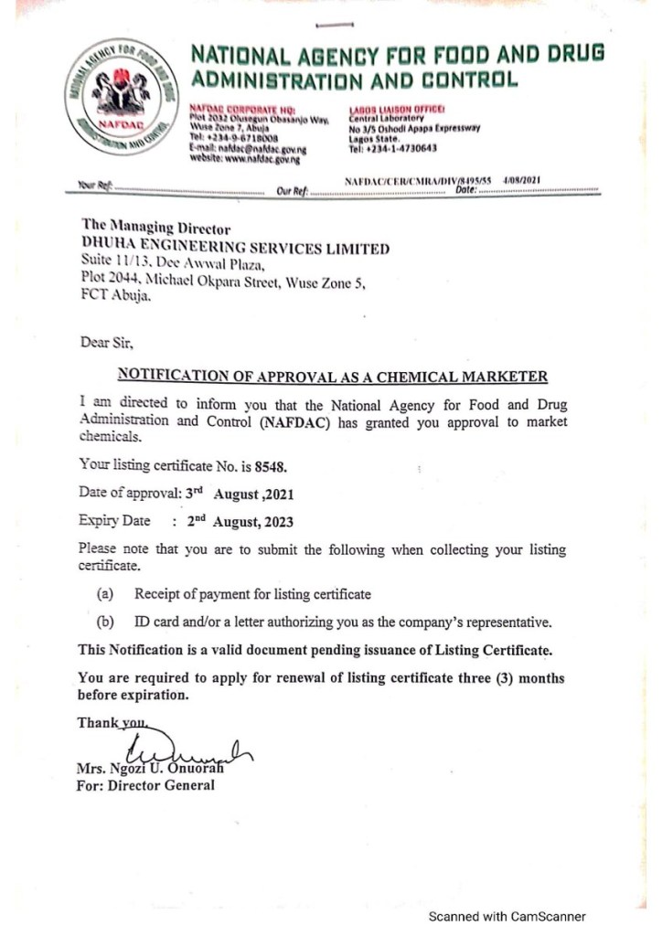 Hydrus Hygiene Ltd approved as Chemical Marketer in Nigeria